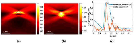 Figure 9c shows the comparison of the simulated and experimentally registered A-scans in a central cross-section of the BPD tube. One can see that the shapes of the OA signals replicate each other, and the calculated diameter of the tube matches the measured one. However, in the numerically simulated A-scan, the BPD tube appeared as a solid object, while in the experiment, the tube was visualized by its upper (point 1 in Figure 9c) and lower (point 2 in Figure 9c) boundaries. This can be explained by the reduced spatial resolution in numerical simulations, specified by the maximum detection frequency of the antenna, which was limited (as compared to that of the real antenna) for the sake of reasonable calculation time.