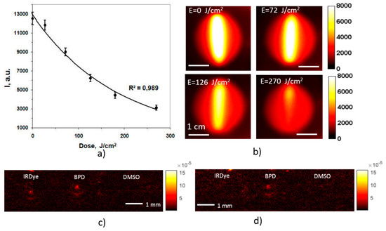 Perspectives of the developed approach in monitoring of a PDT procedure were studied in the course of the BPD photobleaching. The phantom was irradiated at the wavelength of 695 nm, with the intensity at the surface amounting 150 mW/cm2, which is typical for an anti-tumor PDT procedure. The irradiation lasted until the delivered dose amounted to 270 J/cm2, typical for antitumor treatment. Fluorescence images acquired at different stages of irradiation are shown in Figure 10b, together with the corresponding delivered doses. Figure 10a shows the decrease of the fluorescence intensity with the increase of the accumulated dose which indicates photobleaching of the PS. One can see that this dependence is accurately (R2 = 0.989) approximated by an exponential decay law. A photobleaching level of 50% was achieved at the dose of 120 J/cm2, and the level of 80% was reached after the full dose of 270 J/cm 2. Figure 10c,d show the OA B-scans of the phantom with agar mixture obtained at 690 nm before (Figure 10c) and after (Figure 10d) the PDT-mimicking procedure. One can observe a decrease of OA signals from BPD, indicating decrease of absorption as a result of photobleaching. The OA image contrast of BPD at 690 nm, calculated using Equation (1), decreased from 1.1 to 0.5 after the procedure and corresponds to the relative signal decrease of 28% due to photobleaching, which was significantly lower than the corresponding FL signal decrease. This fact indicates that fluorescence imaging is more sensitive to detecting photobleaching compared to OA, which is in good agreement with the results of other researchers [28].