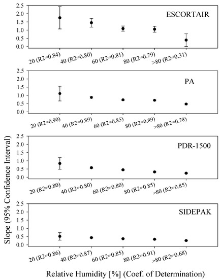 Change of the slope with 95% confidence interval obtained from the regression line of BAM (Beta ray attenuation monitor) on IRMs (Inexpensive real-time particulate matter monitors) or RGMs (research grade monitors) by the degree of relative humidity.