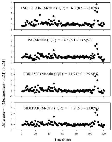 As mentioned above, to conduct a comparative measurement of IRMs, we used the U.S. Environmental Protection Agency (EPA) Federal Equivalent Method (FEM), that is, GRIMM 180 (GRIMM Aerosol, Technik Ainring GmbH & Co. KG, Ainring, Germany) for indoor testing and BAM-1022 (MetOne, Grants Pass, OR, USA) for outdoor field tests [17].
