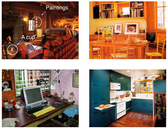 The model’s predictions were tested against human data collected from 91 test images presented on a 21″ LCD monitor as a part of visual search experiment. Human data were collected as a part of a previous study [30]. Participants (N = 18) performed a visual search task on the images of natural indoor scenes taken from the LabelMe open database [31] (see the examples in Figure 1). The total amount of obtained data contained 35 blocks of trials for a visual task (18 participants × 2 blocks, one block was excluded as incomplete).