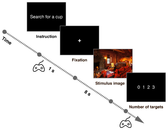 The experiment consisted of two blocks (of 45 and 46 trials), with the goal of searching for “cups” or “paintings”, respectively. The target remained the same within an experimental block, but the order of the blocks and of the images presented within blocks were randomized for each participant. The number of target objects varied for each image, and no participant saw the same image twice. Each trial began with the instruction to search for a particular target shown on the screen until a joystick-button press initiated the trial. A fixation cross was then displayed for one second, until the appearance of the search image. The search image was presented for eight seconds, and participants were asked to search through the image and specify the number of target objects shown after its removal by pressing the joystick up and down buttons. Figure 2 shows the trial sequence. Eye movements were monitored with the Eyelink 1000 eye-tracking system (SR Research Ltd., Ottawa, ON, Canada), sampling at 1000 Hz. Written informed consent was obtained before the experiment from each participant. The experiment and consent form were approved by HSE ethics committee.