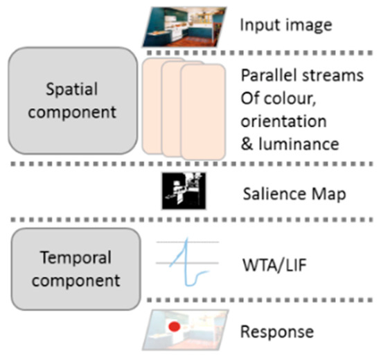 This concept could be implemented on a level of computational model. In Itti and Koch’s model, low-level features (for the classical implementation, they are orientation, colors, and intensity) are extracted from the input image and represented as separate feature maps. At the next step, which reflects an ‘attentive’ stage, these feature maps are normalized and integrated across spatial coordinates into a higher representation, i.e., a saliency map, and the location of the most salient stimulus ‘wins’ a competition between neurons and is therefore attended [6,8]. The final layer of these models of fixation selection are typically implemented with a winner-take-all (WTA) network of neurons using a leaky integrate and fire (LIF) model, which is a neuronal activation model able to predict neuronal spikes [8]. To prevent refixations at the most salient locations, the model implements inhibition of return (IOR), i.e., a mechanism that is commonly believed to impede returning to the recently attended locations and promotes novelty in visual search [9,10] (see also [11] for an alternative point of view on IOR).