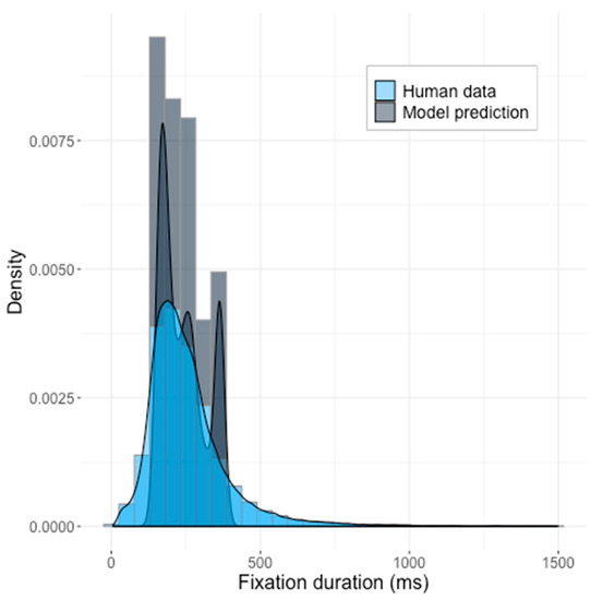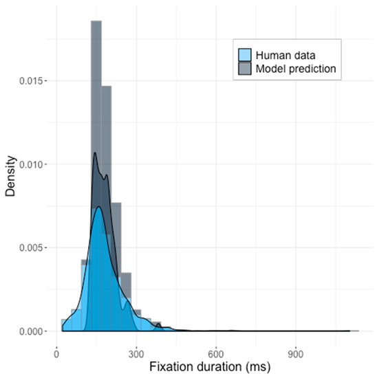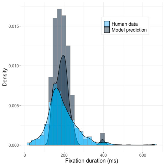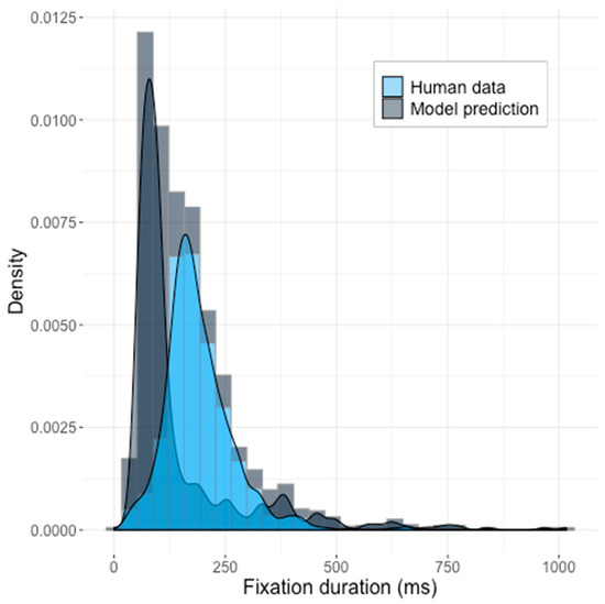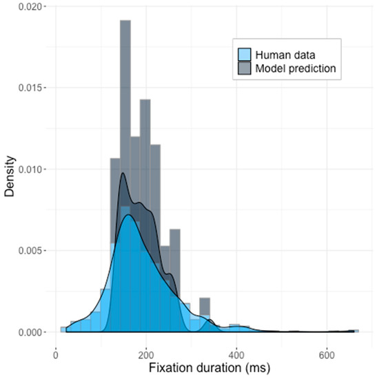 Although the model did produce a skewed distribution, the default model produced shorter fixation durations in comparison to the human data and showed a narrower standard deviation interval (z = 16.38, p < 2.2 × 10−16) (model statistics: mean = 150 ms, SD = 146 ms; human data: mean = 190.8 ms, SD = 77.7 ms). We compared the generated distribution of times to those produced by human participants, using the Kolmogorov–Smirnov test, and we were able to dismiss the null hypothesis that the two were sampled from the same distribution (KS-test: D = 0.58067, p < 2.2 × 10−16, see Figure 4).