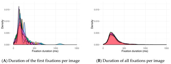 The distributions of saccades’ latency for each image in the dataset. On the left: only initial saccades (16–19 data points for each image). On the right: all saccades (542–794 data points for each image, mean number 661). Both plots show that latencies of saccades, which are related to only one image, nonetheless tend to produce a right-skewed distribution, typical for any RT distribution.