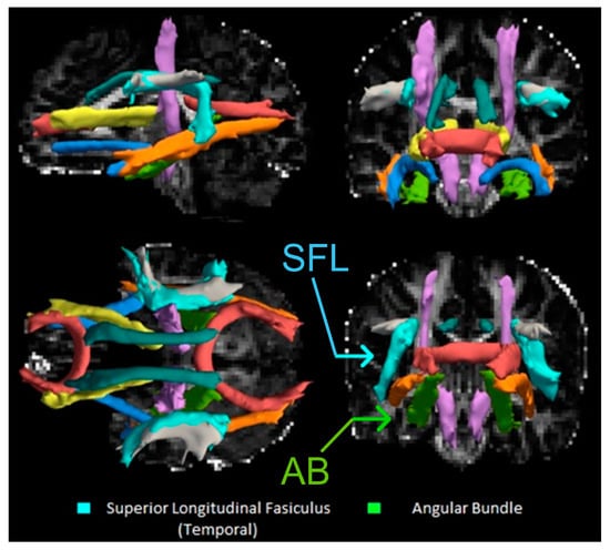 - Nagae, L.M.; Zarnow, D.M.; Blaskey, L.; Dell, J.; Khan, S.Y.; Qasmieh, S.; Levy, S.E.; Roberts, T.P.L. Elevated Mean Diffusivity in the Left Hemisphere Superior Longitudinal Fasciculus in Autism Spectrum Disorders Increases with More Profound Language Impairment. Am. J. Neuroradiol. 2012, 33, 1720–1725. [Google Scholar] [CrossRef] [PubMed]