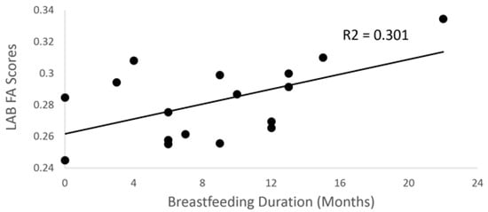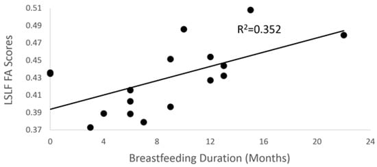 Using stepwise linear regression, breastfeeding duration was positively associated with center FA scores of the left superior longitudinal fasciculus (SLF) (temporal portion; see Figure 2) in the final model (Figure 3; p = 0.019; R2 = 0.35). However, there were no statistically significant associations between breastfeeding duration and standard FA scores (p = 0.14), while a weighted FA score trended toward significance (p = 0.054) for the left SLF correction for covariates in the final model.
