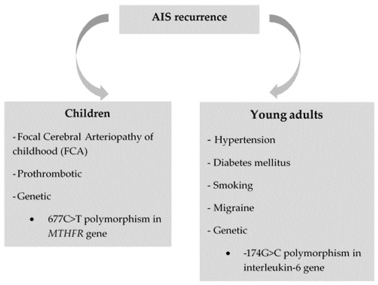 According to the latest definition provided by deVeber et al. [29], recurrent stroke is defined as clinically symptomatic AIS events manifested as acute focal neurological deficits with infarction in a vascular distribution in neuroimaging, which began more than 24 h following the onset of the first stroke. The recurrence of stroke was demonstrated as a factor increasing the risk of mortality in patients. Aarnio et al. [30] observed particularly high mortality among stroke patients who experienced a recurrence of the disease. In the analyzed group of patients, stroke recurrence was the most significant risk factor for mortality after first-ever AIS, with a hazard ratio (HR) equal to 16.68 [30]. Since the etiology of AIS is multifactorial, many risk factors may also be related to the appearance of particular outcomes in both children and adults. Nevertheless, patients who suffer from AIS and have no risk factors for the disease are equally frequent. The data regarding the risk factors for AIS recurrence are not common and a number of them are retrospective. However, understanding the predictors (clinical, metabolic, or genetic) for the occurrence of subsequent ischemic stroke may be helpful in building strategies for secondary stroke prevention.