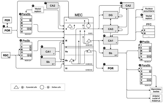Although MEC anatomically forms a I to VI layer structure, this paper defines the following six layers as the information processing unit in MEC: MECI, MECII, MECIII, MECVa, MECVb, and MECVI [53,62,63,64]. The reason for excluding layer IV is that there are few neurons in the IV layer of MEC. Information processing is mainly performed in layers II, III, and V of MEC. Layer V is divided into a thin layer (Va) and a thick layer (Vb). MEC has several types of excitatory cells, mainly pyramidal cells and stellate cells [53]. Pyramidal and stellate cells are also present in ParaSb and PreSb [65]. Inputs to MEC are connections from ParaSb to MECII, from the postrhinal cortex (POR) to MECII via MECI, from PreSb and POR to MECIII, and from the retrosplenial cortex (RSC) to MECVb. ParaSb also receives a projection from the RSC, but the projection is relatively weak compared with PreSb. POR sends new (current) information received from the neocortex [66]. The outputs from MEC are the connections from MECII to DG and CA3, and from MECIII to CA1 and Sb. Moreover, Sb projects to ParaSb and PreSb. These connections have a recurrent structure from a global perspective. CA1 and Sb also project to MECIII and MECVb. Furthermore, CA1 projects to the medial septum, nucleus accumbens, and prefrontal cortex (PFC), as well as to Sb and MEC [67,68,69]. Pyramidal cells in ParaSb and MECII receive the projection from the medial septum, have robust theta rhythmicity [70,71], and are involved in theta-wave generation. The main connections of DG, CA3, CA2, CA1, and Sb are described with reference to the figure by Llorens-Martín et al. [72].