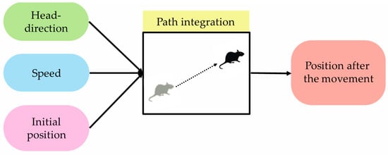 Path integration is one of the functions that support self-localization, which is important for animals to move around the environment. In this paper, path integration is defined as a “function that outputs position information after movement when initial-position information and movement information are input” [6]. Movement information here defines head-direction information and speed information. Figure 2 shows path integration and its input/output information. It was confirmed in the field of neuroscience that path-integration calculation is performed using grid cells [50]. Calculation models in the field of computer science indicate that path integration is realized by grid cells in the MEC [8]. However, since grid cells are present in every layer in the MEC, it is not clear which neurons in which layers calculate path integration.