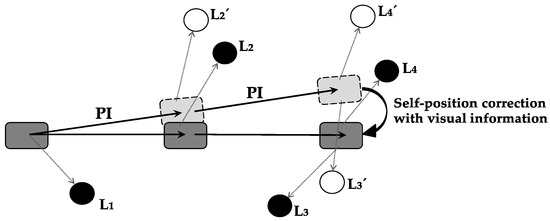 Self-position correction with visual information. PI: Path integration; Ln (black circle): Actual object position; L’n (white circle): Imaginary object position that should be visible from current position obtained by path integration. Dark-gray rectangle represents moving animal and actual position to which the animal is moving. Light-gray rectangle shows animal position obtained by path integration. Calculated position deviates from actual position, since error occurs in the calculation result of animal path integration. Error is corrected using visual-landmark information. Calculation-error size by path integration is difference between white-circle position, indicating imaginary object position, and black circle, indicating actual object position. Correcting this calculation error using visual information and obtaining actual position is self-position correction with visual information in this paper.