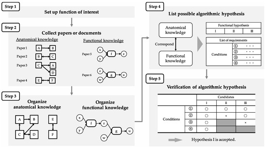 Generalized procedure for finding function-specified region (FSR). Steps 1 to 3 correspond to the review process. In Step 4, the algorithm was constructed, and conditions required for its execution are listed. In Step 5, the algorithm is compared with the SDNC to verify whether region structure, connections, and cell-firing pattern indispensable for execution corresponded to required conditions.