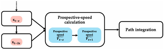 Prospective-speed-calculation algorithm. When two different instances of position information with ε time offset (index information: , ) are input simultaneously, the two position vectors are obtained by converting position-index information for two adjacent instances into metric information. Prospective-speed information () is obtained by calculating velocity vector from difference between two position vectors. Under this assumption, is expressed as because represents speed information to calculate next prospective position .