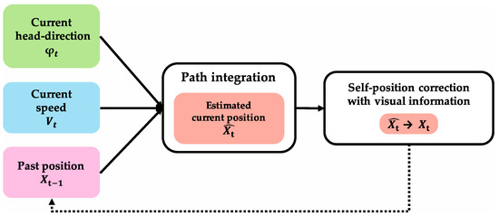 Figure 6 shows the algorithm of path integration that calculates the current position. In the algorithm, when initial-position information and movement information are input, position information after movement () is calculated using grid cells. The region where path integration is performed requires input of head-direction information () and speed information as movement information, and past position at one theta cycle before as initial-position information. To perform self-position correction with visual information, the region that performs path integration outputs the result of path integration to the region that performs self-position correction with visual information. It is suggested that path-integration information projected from MEC and visual information projected from LEC are integrated at DG and CA3 of the hippocampus [59,60,61]. Therefore, self-position correction with visual information is performed by DG and CA3 of the hippocampus. In addition, corrected position information is assumed to be initial-position information for the next path integration. This assumption insists that there is a loop structure that inputs the correction result () as initial-position information from the region where self-position correction with visual information is performed to the region where path integration is performed.