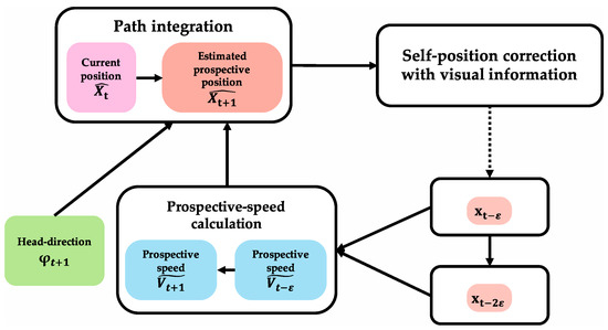 Summarizing the investigated results in Section 3.2, we reached the following four conclusions regarding path integration. First, current and prospective positions are calculated in one theta cycle. Second, path integration derives current-position information by calculating the input initial-position information (position information of an earlier theta cycle) and movement information (head-direction and speed information). At this time, position information corrected with visual information of an earlier theta cycle is used as initial-position information that is necessary for path-integration calculation. Third, since path integration accumulates errors [107], self-position correction with visual information modifies these errors and precisely calculates the current position [106]. Therefore, the region where path integration is performed must output the calculation result of path integration to the region where self-position correction with visual information is performed. Since corrected position information is used as initial-position information in the next time, a loop structure, connecting the region where self-position correction with visual information is performed to where path integration is performed, is required to use the correction result as initial-position information. Fourth, prospective position is obtained by path integration when current-position information is input as initial-position information, and prospective-speed information is input as movement information. Unlike current-position calculations that use input from sensory information on moving, future-position calculations require the use of prospective-speed information, which is expected-movement information. Prospective speed cells were experimentally observed in the MEC of rodents [103], although the mechanism for calculating prospective-speed information in the brain has not been revealed.