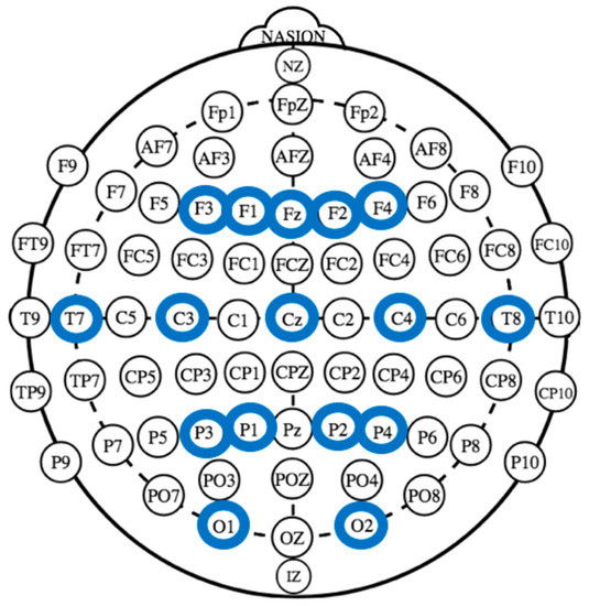 Figure 2. The figure shows the EEG channels location in the following positions: F3, F1, Fz, F2, F4, T7, C3, Cz, C4, T8, P3, P1, P2, P4, O1, and O2.