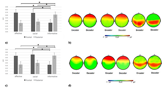 Finally, considering the inter-agents’ role (encoder or decoder), we expected to observe an increase of alpha brain responsiveness (decrease of alpha power) in the encoder compared to in the decoder in the frontal areas for social and affective gestures, due to an increase of emotional response experienced during gesture reproduction [53,54] and to the association with previous experience [55,56,57].