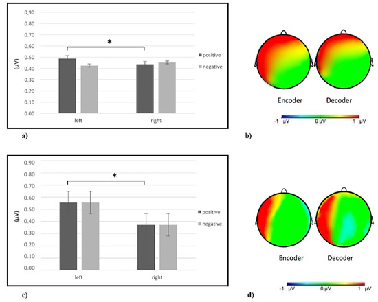 This result appears in agreement with our initial hypothesis, confirming the theory of neural signatures of affective experience [20,21,70], which postulates an increase of left-brain responsiveness according to positive stimuli, inducing an “approaching behavior”, compared to negative ones, which provides an increase of right-brain responsiveness inducing an “avoidance behavior” [71].