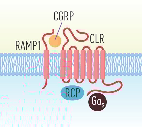 CGRP mediates its effects through the CGRP receptor, a heteromeric receptor complex illustrated in Figure 2. The CGRP receptor is composed of two transmembrane proteins; a G protein-coupled receptor called CALCRL, and a single transmembrane domain protein receptor, RAMP1. This heterodimer is coupled to two cytoplasmic proteins; receptor coupling protein (RCP) and the α-subunit of the GS protein (GαS) [,]. Both the α- and β-CGRP isoforms are complete agonists of the receptor [].