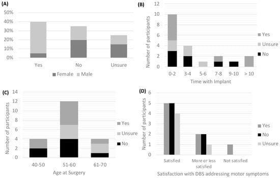 Factors driving patients’ responses about having DBS earlier. (A) Percentage of responses by gender; (B) Number of participants’ responses by time with implant; (C) Number of participants’ responses by age at DBS surgery; (D) Number of participants’ responses by level of satisfaction with DBS addressing motor symptoms.
