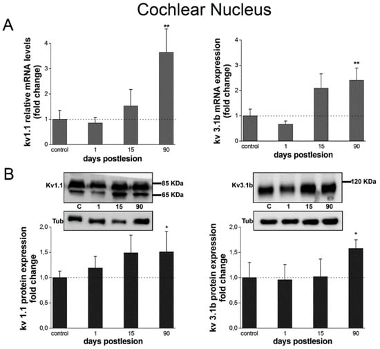 4.3. Kv1.1 and Kv3.1b Gene and Protein Expression Is Up-Regulated in the CN at Long-Term after Cochlear Lesion