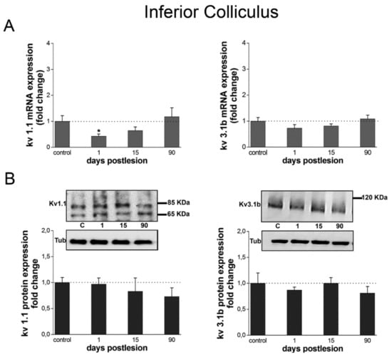Kv1.1 gene expression level was significantly diminished at day 1 after the cochlear lesion, with values 0.43 times below (p = 0.025) those found in the control group (Figure 6A). However, it returned to control levels at 15 and 90 days post-lesion. On the other hand, Kv3.1b gene expression levels did not differ significantly from controls (Figure 6A) at any tested time post-lesion.