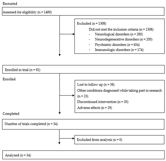Study was conducted in Department of Hygiene, Epidemiology and Ergonomic, Collegium Medicum in Bydgoszcz, Nicolaus Copernicus University in Toruń, Poland. 1400 patients applied to take part in the study and were assessed for eligibility. 1308 were excluded during initial screening due to the presence of other conditions presumably explaining persistent fatigue. Neurological, neurodegenerative, psychiatric and immunologic disorders which were excluding factors comprised those of which mechanisms might presumably explain primary symptoms of ME/CFS. Ninety two volunteers were enrolled into the trial (Figure 1)—all of them were initially diagnosed as CFS patients based on Fukuda criteria [27]. The study was approved by the Ethics Committee, Ludwik Rydygier Memorial Collegium Medicum in Bydgoszcz, Nicolaus Copernicus University, Torun. The 92 patients underwent a baseline assessment that included, body composition analysis, fatigue assessment and autonomic nervous system functioning. Baseline results allowed us to exclude a further 23 patients with other conditions which could explain the presence of persistent fatigue.