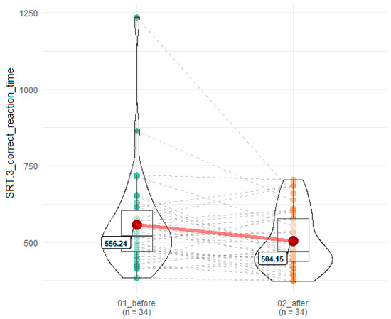 Influence of SEP on reaction time on correct responses in SRT.3. 01_before denotes time point before SEP, while 02_after indicates time point after SEP. Red dots connected by red line indicates mean value, horizontal black line inside the box denotes median value. Green dots before and orange dots after connected by dashed lines denotes results of individual patients. Shape of violin graph indicates distribution of results.