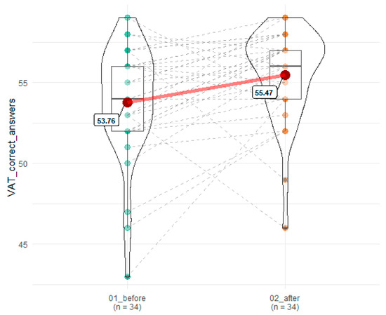 A statistically significant improvement was observed in the number of correct answers and errors committed in VAT (53.77 before vs. 55.47 after SEP), T = 118.5, z = 2.72, p = 0.007, r = 0.34 and 6.68 before vs. 4.68 after SEP), T = 120.5, z = 2.86, p = 0.004, r = 0.35, respectively (Figure 3 and Figure 4).