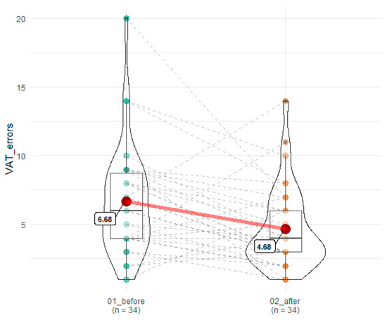 Effects of SEP on errors committed in VAT. 01_before denotes time point before SEP, while 02_after indicates time point after SEP. Red dots connected by red line indicates mean value, horizontal black line inside the box denotes median value. Green dots before and orange dots after connected by dashed lines denotes results of individual patients. Shape of violin graph indicates distribution of results.