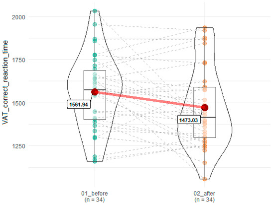 Effects of SEP on reaction time in correct response in VAT. 01_before denotes time point before SEP, while 02_after indicates time point after SEP. Red dots connected by red line indicates mean value, horizontal black line inside the box denotes median value. Green dots before and orange dots after connected by dashed lines denotes results of individual patients. Shape of violin graph indicates distribution of results.