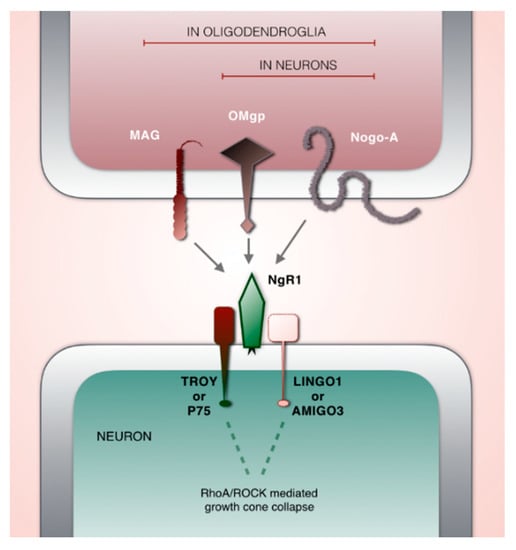 - Wang, K.C.; Koprivica, V.; Kim, J.A.; Sivasankaran, R.; Guo, Y.; Neve, R.L.; He, Z. Oligodendrocyte-myelin glycoprotein is a Nogo receptor ligand that inhibits neurite outgrowth. Nature 2002, 417, 941–944. [Google Scholar] [CrossRef]