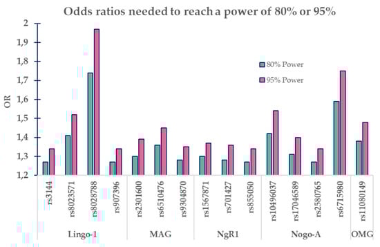 Graph illustrating needed odds ratios (ORs) for SNP’s minor allele frequencies to reach a power of 80% or 95%.
