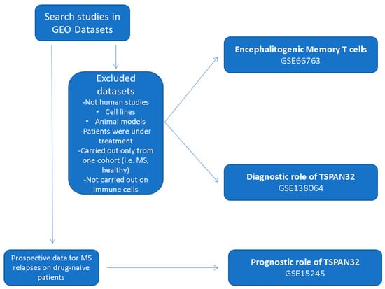 The Gene Expression Omnibus (GEO; https://www.ncbi.nlm.nih.gov/gds) browser was interrogated using the MeSH (Medical Subject Headings) term “Multiple Sclerosis”. Datasets were manually excluded if the studies were not performed on human subjects, if the patients enrolled were under immunosuppressive/immunomodulatory treatment, and if the cell types analyzed were not immune cells. For the evaluation of the expression levels of TSPAN32 in encephalitogenic memory T cells, and the evaluation of the diagnostic role of TSPAN32, datasets carried out only on one cohort of subjects (i.e., MS patients and healthy donors) were excluded. For the afore-mentioned reasons, the analysis was then carried out on the GSE66763 and the GSE138064, respectively. For the determination of the prognostic properties of TSPAN32 in predicting MS relapses, the GSE15245 was selected as it is the only dataset including prospective data on disease evolution. A flowchart of the in silico study design is provided as Figure 1. The characteristics of the datasets used are described in the following sections.