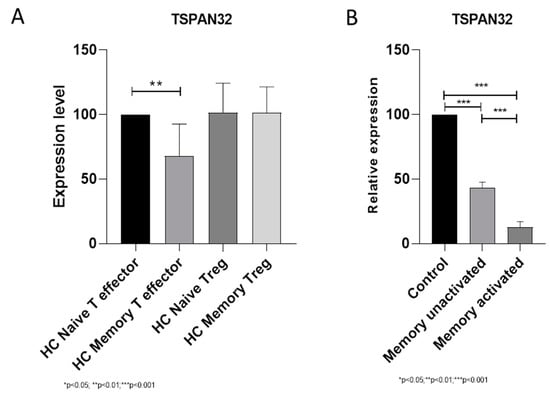 (A) Basal expression levels of Tetraspanin-32 (TSPAN32) in naïve T effector, Treg, memory T effector, and memory Treg cells from healthy donors; (B) modulation of TSPAN32 expression in memory T cells upon reactivation. ** p < 0.01, *** p < 0.001.