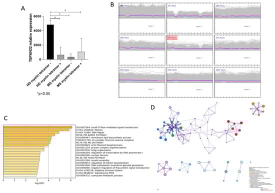 (A) TSPAN32 expression in memory T cells from healthy donors and multiple sclerosis (MS) patients; * p < 0.05; (B) clusters of genes obtained from the self organizing map (SOM) analysis; (C) most enriched biological processes by genes commonly regulated with TSPAN32, as obtained from SOM analysis; (D) network showing the interconnection among the most enriched biological processes by genes commonly regulated with TSPAN32, obtained from SOM analysis.