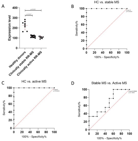 (A) TSPAN32 in peripheral blood mononuclear cells (PBMCs) from healthy donors and RRMS patients in stable and relapsing disease; (B) receiver operating characteristic (ROC) curve for TSPAN32 in healthy controls (HC) and multiple sclerosis patients in stable disease; (C) receiver operating characteristic (ROC) curve for TSPAN32 in healthy controls (HC) and multiple sclerosis patients in active disease; (D) receiver operating characteristic (ROC) curve for TSPAN32 in multiple sclerosis patients in stable and active disease.