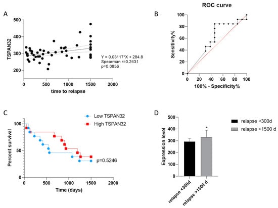 Finally, we evaluated whether the different transcriptional levels of TSPAN32 in PBMCs from MS patients could promote disease exacerbation or protect MS patients from acute relapses. Non-parametric correlation between TSPAN32 and the time-to-relapse revealed a trend of direct correlation, which did not reach the statistical significance (p = 0.0856) (Figure 5A). ROC curve area was 0.6036, entailing a p = 0.3695 (Figure 5B). However, Log-rank analysis performed on patients divided into two groups based on the expression level of TSPAN32 in PBMCs (referred as High and Low TSPAN32) showed that a trend of protection from acute relapses was observed in patients expressing higher TSPAN32 levels (Figure 5C). In addition, significantly lower levels of TSPAN32 were found in PBMCs from MS patients developing exacerbation of the disease before 300 days as compared with patients who underwent relapses later than 1500 days (Figure 5D).