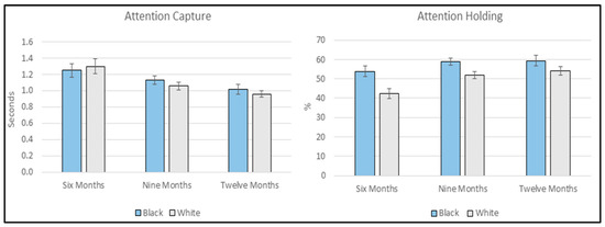 To investigate differences in attention holding for own- and other-race faces once they had been initially fixated, a 3 (Age: 6-, 9-, or 12-months) × 2 (FaceRace: black or white) mixed ANOVA was conducted. Attention holding was necessarily converted to a percentage value to prevent this analyses being confounded by differences in initial looking time. The ANOVA yielded a main effect of Age (F(2, 169) = 5.168, p = 0.007, ŋp2 = 0.058) and a main effect of FaceRace (F(1, 169) = 34.862, p < 0.001, ŋp2 = 0.171) but the interaction failed to reach significance (F(2, 169) = 1.909, p = 0.151, ŋp2 = 0.022). Post-hoc Bonferroni corrected comparisons found that 6-month-old infants differed significantly from both 9- (p = 0.023) and 12-month-old infants (p = 0.011). No other age comparisons reached significance. Inspection of means (See Figure 2 and Table S2) showed that infants looked longer toward black faces relative to white faces.