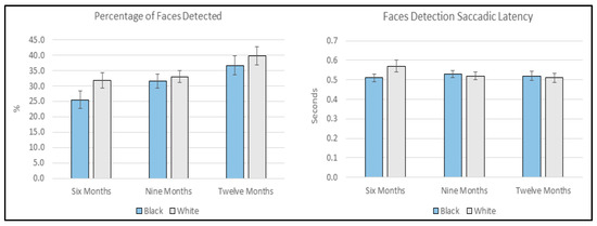 In order to explore the percentage of faces that were detected, a 3 (Age: 6-, 9-, or 12-months) × 2 (FaceRace: black or white) mixed ANOVA was conducted. The ANOVA yielded a main effect of Age (F(2, 169) = 4.637, p = 0.011, ŋp2 = 0.052) and a main effect of FaceRace (F(1, 169) = 4.585, p = 0.034, ŋp2 = 0.026) but the interaction failed to reach significance (F(2, 169) = 0.699, p = 0.499, ŋp2 = 0.008). Post-hoc Bonferroni corrected comparisons found that 6-month-old infants detected significantly fewer faces relative to 12-month-old infants (p = 0.009) and inspection of means (See Figure 3 and Table S3) showed white faces (M = 34.50%, SD = 18.37) were more likely to be detected relative to black faces (M = 31.25%, SD = 20.50). No other age comparisons reached significance.