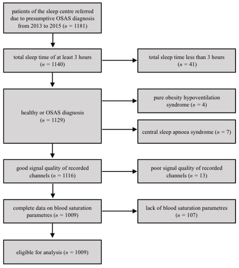 Flow chart showing selection of the patients eligible for the analysis in the studied group of patients with suspected obstructive sleep apnea syndrome (OSAS). n—number of observations.