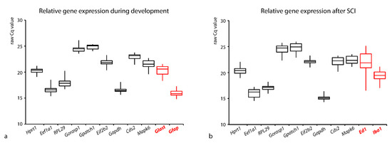 The mean Cq values of the individual RGs during postnatal development and after SCI ranged from 16.7 to 24.8 and from 15.1 to 24.6, respectively. In both experiments, the lowest mean Cq values (the highest gene expression) were recorded by Eef1a1 and Gapdh and the highest mean Cq values (the lowest gene expression) were observed by Gorasp1 and Gpatch1. However, the differences between the expression (Cq values) of the tested RGs and the analyzed TGs were not so eminent (Figure 1). For example, the mean Cq value of Glast during development was a maximum of 4.6 cycles lower compared to the RG with the highest expression and 3.6 cycles higher compared to the RG with the lowest expression (Figure 1a). Similarly, the mean Cq value of Iba1 in samples in the SCI experiments was approximately 5.2 cycles lower and simultaneously 4.4 cycles higher compared to RGs with the highest and lowest expression, respectively (Figure 1b).