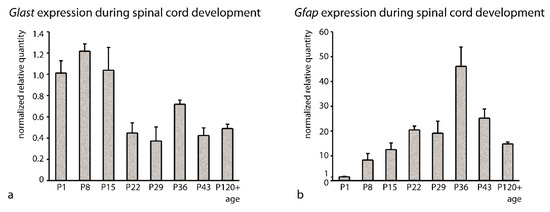 Relative gene expression of Glast (a) and Gfap (b) in the spinal cord during rat postnatal development. Normalized relative gene expression at P1, P8, P15, P22, P29, P36, P43, and P120+ (adulthood) represents the average of three biological replicates ± standard deviation (SD). The expression of the genes is normalized by the normalization factor based on the expression of Gapdh and Eef1a1.