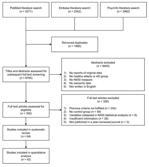 In a first phase of selection, two independent reviewers (MJ, CG) read titles and/or abstracts and excluded articles (a) not reporting original data (e.g., reviews, meta-analyses, opinion letters), (b) not assessing a group of healthy older participants or a group of participants with a diagnosis of AD, (c) not measuring the N400 event-related potential, (d) not implementing a semantic task with the manipulation of a semantic variable, and (e) not written in English. This left a total of 392 original studies. Two reviewers then performed a full text screening (MJ, CB) and further excluded 328 of the 392 studies due to the preceding reasons or if the studies (f) had no statistical comparison with a control group (i.e., a group of younger participants to be compared with the healthy elderly group, or a group of healthy elderly participants to be compared with an AD group), (g) presented different conditions collapsed in the N400 statistical analysis, making it impossible to isolate the effects of the semantic variable manipulated, (h) had insufficient information, preventing us from assessing all eligibility criteria, and (i) were not published in peer-reviewed journals, since unpublished studies tend to show lower methodological quality than peer-reviewed articles [29,30]. In case of disagreement, a third reviewer (MW) performed the screening to help reach a final decision. This procedure led to the inclusion of 64 studies in the review (Figure 1). In order to perform the statistical analyses of the quantitative review, we needed to extract mean values (i.e., group means of performance) for experimental outcomes of interest from the articles in the review. These mean values were reported in 42 studies out of the 64 retained for the present review. These studies were thus those included in the quantitative analysis. The 64 articles were included in the qualitative review.