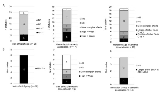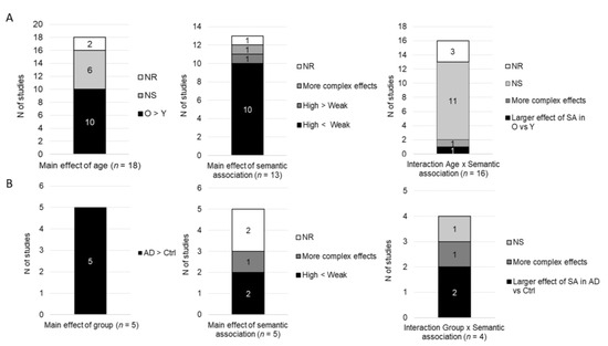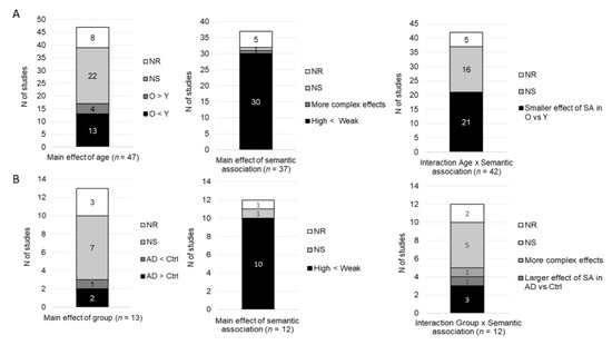Qualitative results for behavioral response times: main effects of age/group, semantic association and the interaction group x semantic association. (A) Studies including older and younger groups of participants. (B) Studies including AD participants and control groups. N of studies: Number of studies; O: Older; Y: Younger; AD: Alzheimer’s disease; Ctrl: Control group(s); NS: No significant effect; NR: Statistical significance not reported; SA: Semantic association.