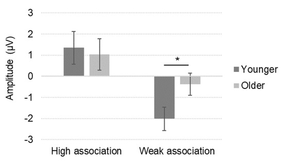 Mean N400 amplitude (± SEM) as a function of age group and semantic association in the reviewed studies (n = 21). * p < 0.05.