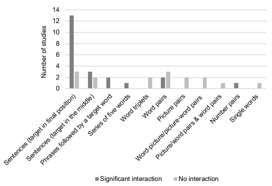 In most of the studies, stimuli were sentences with the target word in the final (n = 24), medial (n = 6) or varying positions (n = 1). Other experimental tasks involved word pairs (n = 15), picture pairs (n = 5), or word-picture/picture-word pairs (n = 4). Other studies included phrases followed by a target word (n = 5), series of five words (n = 1), word triplets (n = 2), single words (n = 3) or number pairs (n = 1). Target stimuli were either presented visually (n = 52), auditorily (n = 11) or both (n = 1). Word stimuli were in English (n = 36), Dutch (n = 6), Chinese (n = 5), French (n = 2), Swedish (n = 2), German (n = 2), Hungarian (n = 1), Finnish (n = 1), Korean (n = 1) or in two different languages within the same task (n = 2). From the 57 studies which involved an experimental task with words as targets, 34 matched stimuli across some conditions for at least one psycholinguistic variable (e.g., word length, frequency). Of note, psycholinguistic characteristics of words were reported in nine additional studies, although no statistical tests were performed for the matching of stimuli.
