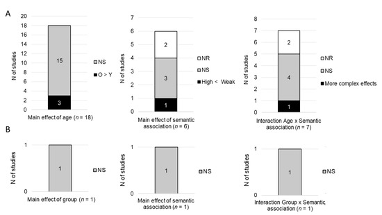Qualitative results for the N400 peak latency: main effects of age/group, semantic association and the interaction group x semantic association. (A) Studies including older and younger groups of participants. (B) Studies including AD participants and control groups. N of studies: Number of studies; O: Older; Y: Younger; NS: No significant effect; NR: Statistical significance not reported.