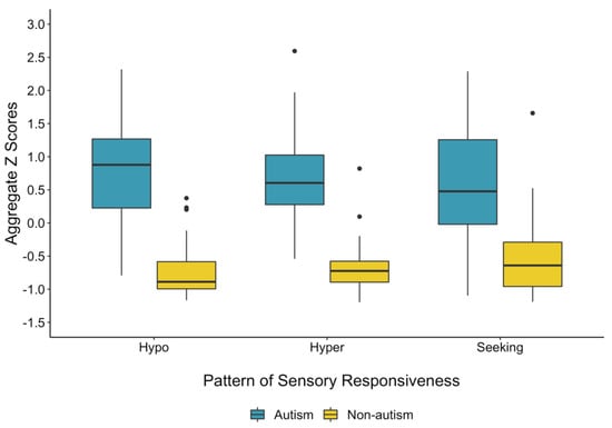Autism is a neurodevelopmental condition that has conventionally been defined by differences in social communication and by the presence of restrictive and repetitive patterns of behaviors, interests, and activities (RRBs) [1]. The most recent diagnostic criteria, however, additionally recognize differences in sensory functioning as a diagnostically relevant feature of autism [2], and a growing body of literature shows that individuals with autism (see Supplementary Materials File S1 for information on our flexible use of terminology) present with altered patterns of sensory responsiveness compared to non-autistic peers [3,4]. Three patterns of sensory responsiveness are commonly described in the literature: hyperresponsiveness, or exaggerated responding to sensory stimuli; hyporesponsiveness, or reduced responding to sensory stimuli; and sensory seeking, or craving of certain sensory stimuli [4,5,6,7]. Although these classifications may be distinct, they are not mutually exclusive or restricted to one sensory modality; individuals can and do present with varied combinations of alterations across patterns of sensory responsiveness and sensory modalities, e.g., [3,8].