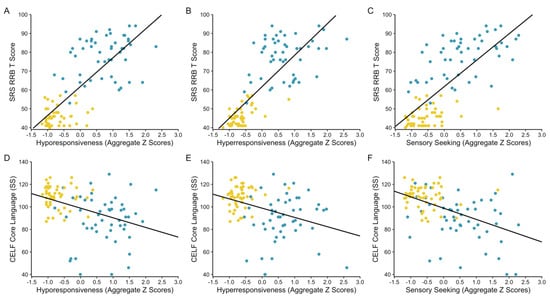 Scatterplots depicting selected associations between patterns of sensory responsiveness and features of autism. All three patterns of sensory responsiveness were positively correlated with the restricted, repetitive behaviors (RRB) index T scores from the Social Responsiveness Scale (SRS; (A–C)) [45] and negatively correlated with core language standard scores (SS) from the Clinical Evaluation of Language Fundamentals-Fourth edition (CELF; (D–F)) [50]. All depicted associations were statistically significant; effects of interest were observed across, and did not significantly vary according to, diagnostic group (autism group plotted in blue; non-autism group plotted in yellow).